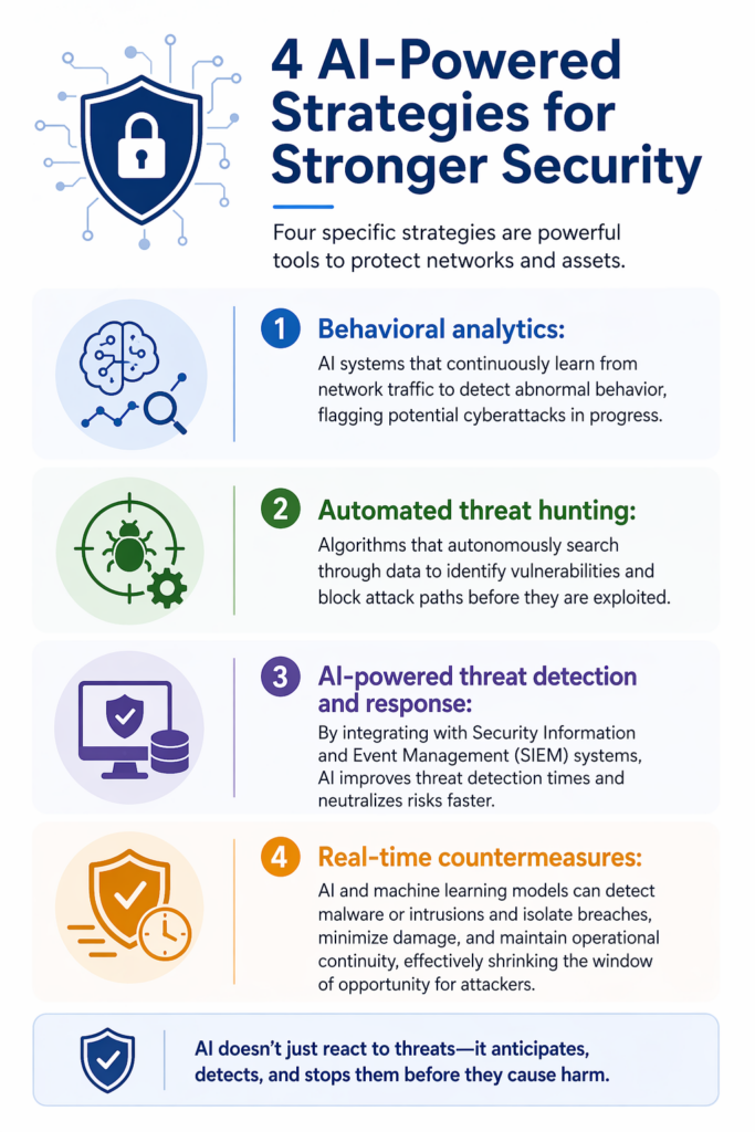 - AI-powered threat detection and response: By integrating with Security Information and Event Management (SIEM) systems, AI improves threat detection times and neutralizes risks faster.
