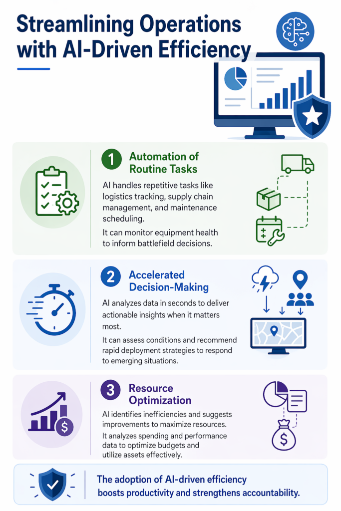 Operational efficiency is a critical factor in maintaining mission readiness and optimizing limited resources. AI powers high-performance solutions to reduce human error and accelerate decision-making. When integrated into defense programs, AI-driven tools allow leaders to focus on strategic priorities rather than administrative burdens.