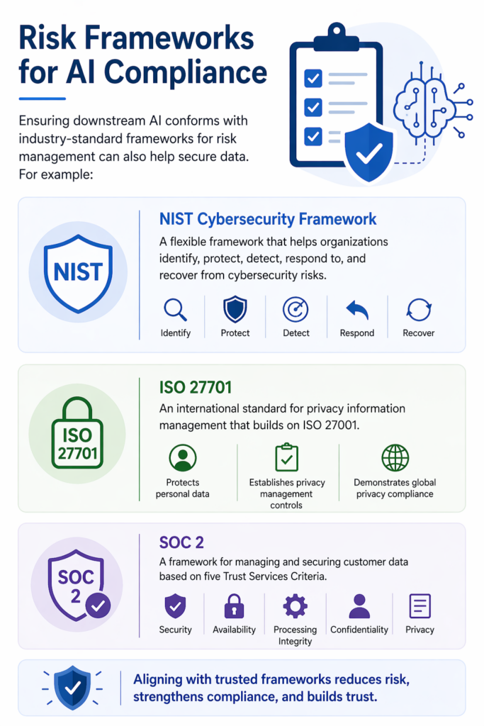 Ensuring downstream AI conforms with industry-standard frameworks for risk management can also help secure data. For example: